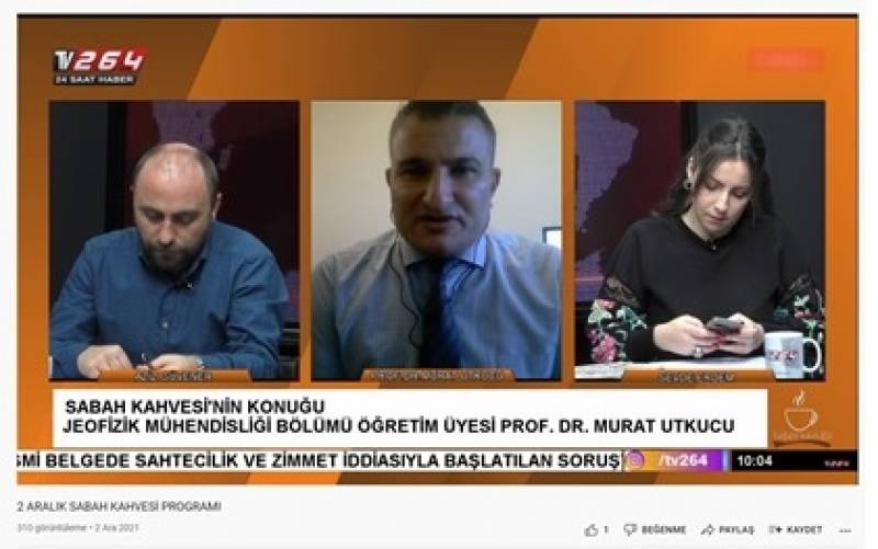 Müdür Yardımcımız Prof.Dr. Murat UTKUCU 2 Aralık 2021’de yerel televizyon kanalı TV264’deki Sabah Kahvesi programının canlı yayınına davet üzerine katılarak “Sakarya ilinin deprem tehlikesi” konusundaki soruları yanıtladı. Programın videosuna aşağıdaki linkten ulaşılabilir.