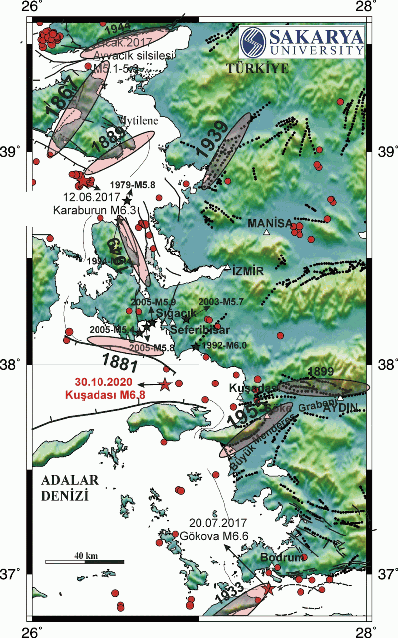 - Batı Anadolu ve Adalar Denizi oldukça diri bir tektonizmaya ve depremselliğe sahiptir. Batı Anadolu’da son 30 yıl içinde meydana gelmiş yıkıcı büyük depremlere örnek olarak 1995 Dinar (M2), 2000 Sultandağ (M6.0) ve 2002 Çay-Eber (M6.4) depremleri gösterilebilir. 2017 yılında Türkiye’nin Adalar Denizi sahilleri boyunca 3 yıkıcı deprem oluşmuştur. Ocak 2017’de Ayvacık’da (Çanakkale)’de 4 adet önemli deprem (M5.0-5.5) az da olsa yıkıma yol açmıştır. 12 Haziran 2017’de Karaburun-Midilli depremi (M6.3) ve 20 Temmuz 2017 Gökova Körfezi-Bodrum (M6.6) depremi meydan gelmiştir. 30 Ekim 2020 Kuşadası Körfezi depremi (M=6.8) Türkiye’nin Adalar Denizi sahillerinde 2017 yılından bu yana meydana gelen 4. yıkıcı deprem olmuştur. Bu açıdan 2020 Kuşadası Körfezi Depremi’nin oluşumu bir sürpriz olarak düşünülemez. Nitekim son 50 yıl içinde İzmir yakınlarında büyüklüğü M5.4-6.0 olan 6 adet deprem meydana gelmiştir (Şekil 1). Şekil 1’de Ocak 2010 ile Nisan 2017 arasında meydana gelen büyüklüğü M4’den büyük depremlerin yerleri de gösterilmiştir. 2017 Karaburun-Midilli ve 2017 Gökova-Bodrum depremleri dış merkezleri civarındaki ve Kuşadası Körfezi’ndeki depremler dikkat çekicidir ve belki de gelecekte oluşacak adı geçen depremlerin ayak sesleridir. Bu gözlem depremlerin izlenmesinin, kayıt altına alınmasının, deprem bilim çalışmalarının ve bu konuda yetişmiş uzmanların önemini gözler önüne sermektedir. Adalar Denizi sahillerinde doğal güzellikleri ile göze çarpan çok sayıda körfez ve koyların faylar boyunca oluşan tektonik hareketler ile oluştuğu bu bağlamda hatırlatılmalıdır.